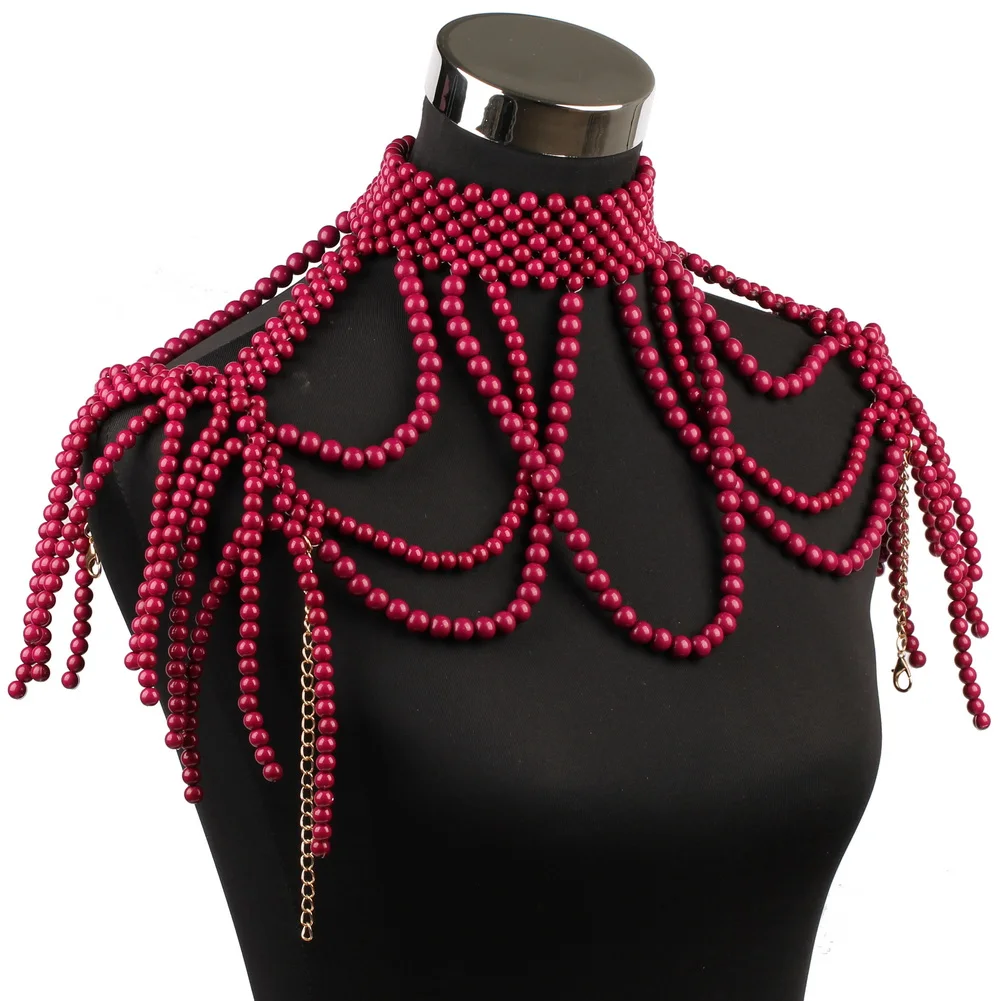 Chunky Bead Pendant Choker Long Statement Necklace for Women Fashion Chain Costume Body Jewelry Pearl Shoulder Necklace